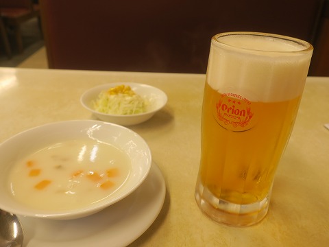20:48 待たずして ほとんど待たずして、生ビールとセットのスープとサラダが運ばれてきました。 生ビールはオリオンビールの生。 クセの無いサッパリした飲み味で、飲みやすいです。 サラダはキャベツの千切りとコーンにドレッシングがかかったもので、コールスローっぽく、サッパリしていて美味しいです。 スープはポタージュだと思うんですが、コンソメに小麦粉でとろみを付けた様な味わいで、ちょっと不思議。 なんて表現したらいいのかな? 不味くはないんだけど。 昭和の時代に家庭で自家製で真似て作ったスープみたいな感じ。って表現じゃ伝わらんよね。(笑) |