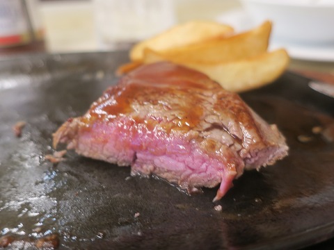 21:00 焼き具合は やっぱり焼きは甘いです。(笑) ミディアムで注文しましたが、鉄板の上に置いてしばらくたっていてレアーからミディアム レアーな感じでしょうか。 自分はこれくらいの肉がピンク色になるくらい、火の通ったものが好きです。 赤身の残った肉が苦手な人は、”ウェルダン”でしっかりと「赤身苦手です。」って伝えないと、ダメかな。 |
