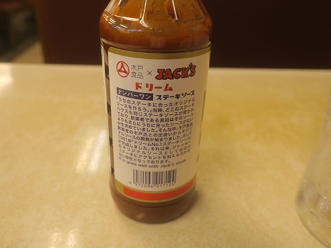 21:02 ステーキソースは ここのお店の特徴になるステーキソースを観察してみた。(笑) 沖縄県で一般に市販されているものかと思ったら、違うみたいですね。 ボトルの裏を見てると、”木戸食品 × ジャッキー”って書いてあって、共同で開発したみたいです。 |