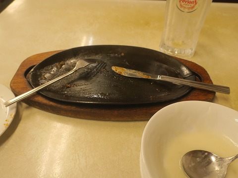 21:05 十分満足 完食。 「肉、旨かったねぇ。」 肉の量、250gで足りるかな~。って思ってましたけど十分でしたね。 このお店ステーキ以外にもフライ チキンやタコス、スパゲティ、スキヤキ(?)、ヤキソバやカレーライス、サンドイッチ、ハンバーガー等々なんかもあります。 足りなければ、タコス食べようかなぁ~。って密かに思っていたんですけどね。(笑) 「ごちそうさまでした。」 <(_ _)> |