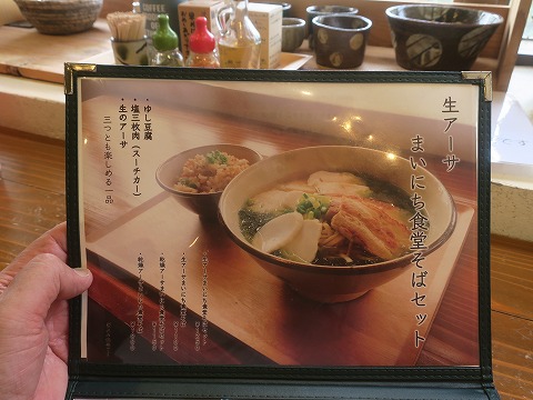 13:02 生アーサまいにち食堂そばセット 5分ほど待って、”生アーサまいにち食堂そばセット”が運ばれてきました。 それでは、「いただきましょう。」 アーサって、本土で言うと海藻の”あおさ”の事だそうです。 沖縄の方言ですね。 生のアーサって言うことで、なかなか食べられない食材で、珍しいらしいです。 海藻の香り満載で美味しいです。 |