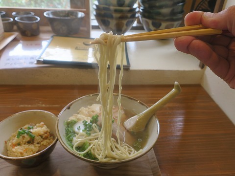 13:02 麺は 麺を持ち上げると、うどんよりかは細いけど、ラーメンとしてみると太麺ですね。 じゃっかんの縮れがあります。 表面がちょっとざらっとした感じで、スープがよく絡みます。 スープは、ブタとカツオの出汁かな。 意外に脂っこさはありません。 サッパリとした塩味のスープで、夏の暑い日でも美味しく食べられます。 |
