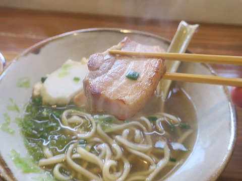 13:05 三枚肉 トッビングの三枚肉。 分厚いですが、煮込まれていて柔々です。 美味しい。 (^_^) 熱いけど、水分と同時に塩分も補給出来るのがイイんでしょうね。 麺とトッピングを先に食べて、残ったスープを汁物にして炊き込みご飯の”じゅーしー”と一緒にいただきます。 美味いね。 沖縄の気候に合っていると思います。 |