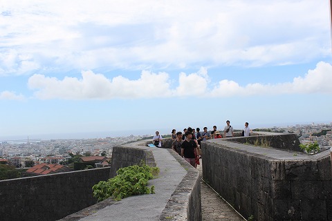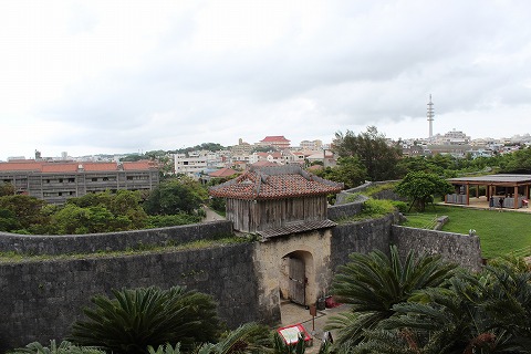 15:04 高台は 正殿跡の裏側にまわってみた。 裏は公園内で一番高い丘になっていて、標高は130mほど。 琉球王朝時代、沖縄の最大の港であった那覇港の様子を見ることができます。 天気が良ければ、沖縄本島から西に40kmほどの沖合いにある慶良間諸島(けらま しょとう)まで見渡せるらしい。 (当日は、高温のため水平線近くの視界が悪く見ることはできませんでした) この場所は、”西のアザナ(いりのあざな)”と呼ばれているらしい。 |