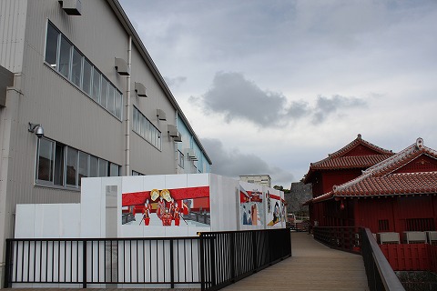 14:54 建物の壁面には 中に入ると、プレハブの建物の壁面に、正殿のイメージが書かれています。 |