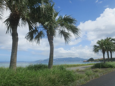 10:06 南国感 国道58号線を名護市に向けて北上中。 青い空にエメラルドグリーンの海、それにヤシの木(?)、南国感満載です。 直射日光ギラギラで、昨日買ったクールウェアーは大活躍です。 止まっているとそれなりに暑いですが、走り始めると汗が気化してスーッと涼しく感じます。 |