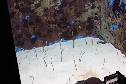 11:43 チンアナゴも チンアナゴもいる。 よく見ると、体に縞があるのと無いの種類があるみたいです。 巣穴(?)から出たり入ったりするのを見ることができますが、巣穴からたまぁ〜に出て移動することがあるらしい。 |