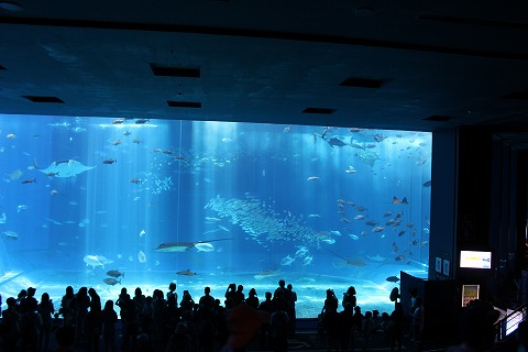 11:55 巨大水槽に ようやくジンベエザメのいる巨大水槽までやってきました。 巨大。 容量は7,500m3あるそうで、深さが10m、幅35m、奥行き27mの大きさだそう。 正面は、ガラスではなくてアクリル製。 高さが8.2m、幅22.5mとほぼ水槽の片面がアクリルの窓で出来ています。 そして7,500t 以上ある水の圧力に耐える厚さは60cmあるそうです。 ちなみにこのアクリルパネルの総重量は135t と、ちょっとしたトリビア。(笑) |