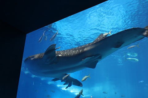 11:56 ジンベエザメ なんて巨大水槽を見て「凄いなぁ。」なんて思っていたら、ジンベエザメが回遊してきました。 「デカいねぇ〜!」 8mほどあるらしいです。 ゆっくりと泳ぐ姿は貫禄ですね。 ジンベエザメは日本の他の水族館でも見ることができるらしいですが、この大きさのジンベエザメを見ることが出来るのは、ここ美ら海水族館だけのようです。 |