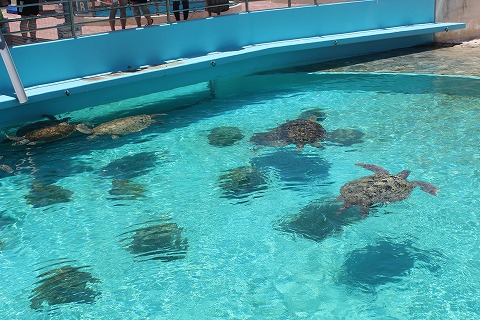 12:43 ウミガメもいます 他の建物で、こちらは”ウミガメ館”。 その名の通り、ウミガメがいます。 水槽を上から見てもイマイチ。 大きな岩が漂っているみたいに見えます。(笑) |