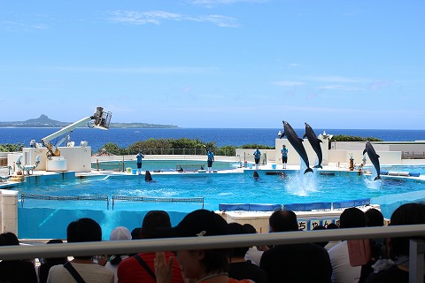 12:51 オキちゃん劇場に 1時からイルカのショーがあると言うので、イルカのいる”オキちゃん劇場”までやってきました。 (オキちゃんはここのイルカの愛称らしい。) 10分前だけど、お客さんが入り始めているので、席に座ります ここも美ら海水族館とは別の施設(?)で、無料で観覧することができます。 |