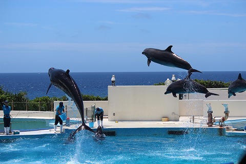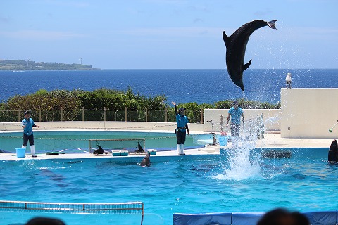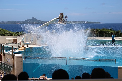 13:00 イルカのショーが 1時になってイルカのショーが始まりました。 背景の海がきれいにマッチしてます。 |