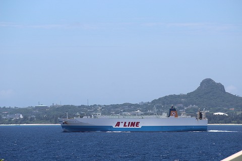 13:24 伊江島は オキちゃん劇場から外に出ました。 伊江島との間をフェリーが通過していきます。 鹿児島と沖縄本島の本部を結ぶフェリーかな。 背景の伊江島は美ら海水族館のある本島から9kmほど沖合いにあり、珊瑚礁の隆起によって出来た島で、突き出ているのは標高172mほどの城山(グスクやま)。 島の35%は米軍の施設ですが、その他はマリンリゾートなどを楽しむ施設もあるそうです。 |