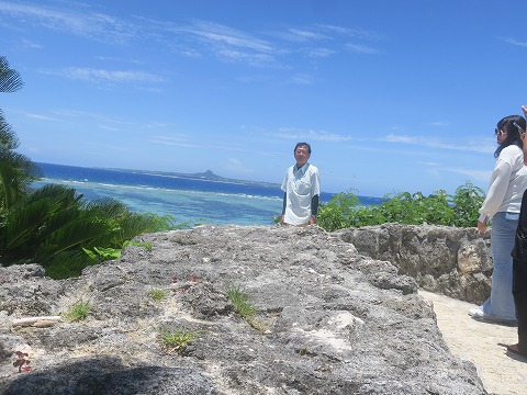 12:32 借景? 水族館から外に出ると、目の前に海が広がっています。 きれいです。 沖に見えるとんがり帽子の島は、伊江島と言うらしい。 いい風景なので、写真を撮ろうと思ったけど、先の人がスマホで(おそらく映える写真を)撮っていて動きません。 面倒臭いので、借景じゃないけど写真一緒に入ってもらいました。(笑) 映える。(笑) |