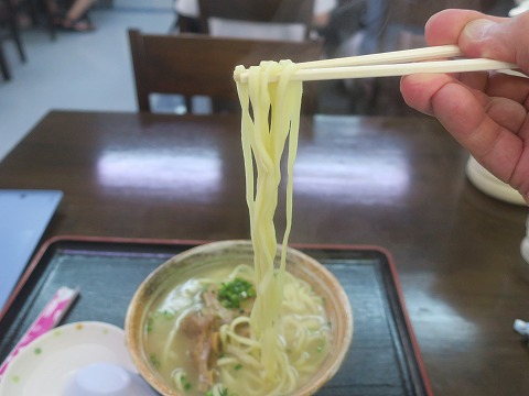 14:36 中太麺 麺は縮れのない中太麺。 麺の肌は、チュルチュルとした感じではなく、ちょっと荒れた感じでスープがよく絡みます。 スープは、塩味で豚の出汁とカツオ節かな。 後はわからないです。(笑) 沖縄そばは、ラーメンと食感が違ってどちらかと言うと うどんに近い感じがしたんですが、ラーメンの材料と同じかん水は使っているみたいですけど。 ラーメンとは明らかに違う味なんですよね。(当たり前か) |