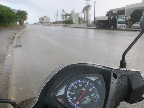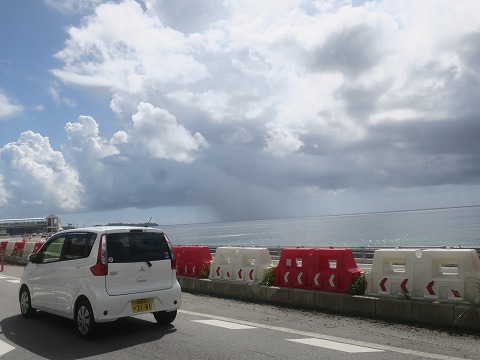 15:19 沖のひと所に 5分も走ったら雨は止んで、日差しが戻ってきました。 スクータで走っていることもあって、走行風と強烈な日差しで、びしょ濡れになった服がどんどん乾いていきます。 しばらく走っていると、右手前方の海には”沖のひと所に降る雨”。 南の島ならではの光景ですね。 |
