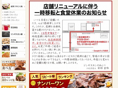 あんべは休業中 今回のツーリングでも遠野ではジンギスカンを食べようと考えていました。 今日訪れた”遠野食肉センター”は過去2回訪れているので、今回は2020年に訪れてことのある”ジンギスカンのあんべ”を再訪してみようかと考えていました。 出発前に調べたら、全面改装のため食堂休業とのこと。 残念ですが、遠野食肉センターに3度目の訪問をすることにしました。 |