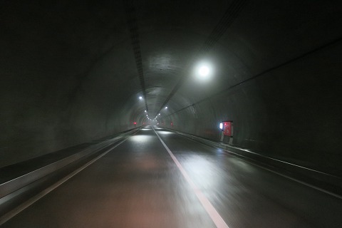 15:05 トンネル内は湿気で 押角峠直下に建設された押角トンネルを走行中。 押角トンネルの延長はおおよそ3kmほど。 このトンネルの様に、延長が長いトンネル内は中がヒンヤリして気持ちいいです。 交通量はほとんど無くて、トンネル内ですれ違ったクルマはありませんでした。 退屈なのでデジカメを出して写してみましたが、この時期延長の長いトンネル内は湿気で路面はビチャビチャです。 飛ばしすぎると、滑ることもあるので注意しながらアクセルを開けていきます。 押角トンネルを出るともう路面の濡れているところはありませんでした。 |