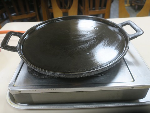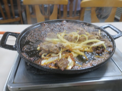19:02 鉄板に ほとんど待たずして、鉄板の上にタレに混ぜられた牛バラ肉とタマネギがドンと載せられました。 それなりにタレの量がありますが、この縁がほとんど無い鉄板で大丈夫か、あふれないかと思うほど。 |