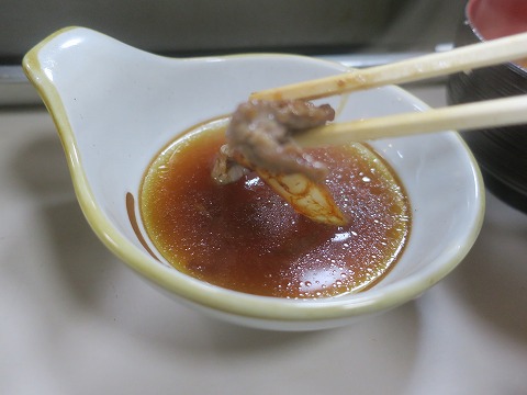 19:17 付けダレは 一緒に供される付けダレ。 このタレはサッパリ味。 薄めのポン酢って感じで、酸味があります。 普通、付けダレって料理に味を載せるものですけど、これは違う。 こってりとした味が付いた肉のタレを少し落として、サッパリ食べさせる機能。 付けダレの発想転換ですなぁ。 |
