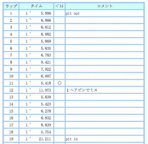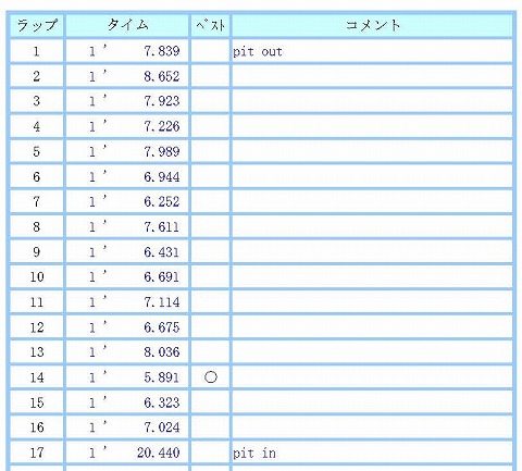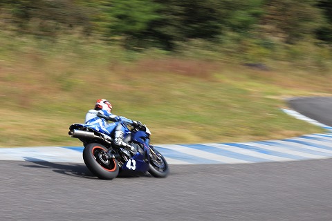 10:49〜11:10 走行2本目 40分程休憩したら、再度コースインします。 1本目で5秒台に入ったので、自分的には気が楽になりました。 前評判でV4の方が難しいよ。って前情報があったんでね。 そして、エビスサーキット東コースの鬼門が通称便所前コーナーのR21の左のヘアピンカーブの9コーナー。 肩の後遺症でコーナーの入口で上半身を安定させられなくてね。 寝かし込みでワンテンポ遅れちゃう。 色々とチャレンジしてますが、疲労が溜まると、やっぱりダメ。 で、色々試しながら走行。 11周目に2本目のベスト5秒4。 後からラップタイムを見たら、結構5秒台に入っているので、まあ自分的にはよろしいかと。 あまりやり過ぎて転んだら目も当てられませんからね。(^_^;) 新品のタイヤを導入した効果が出ていますねぇ。(笑) 17周回ほどしたら燃料ランプが点滅を始めたので、ピットインして2本目の走行は終了です。 |