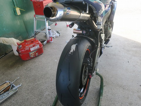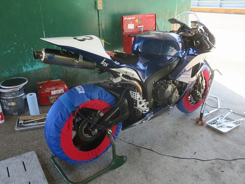 9:14 暖め中 走行の準備をしながら、タイヤを暖め中。 8時半くらいから暖め始めたので、もうちょっと1時間以上は暖めたいですね。 |