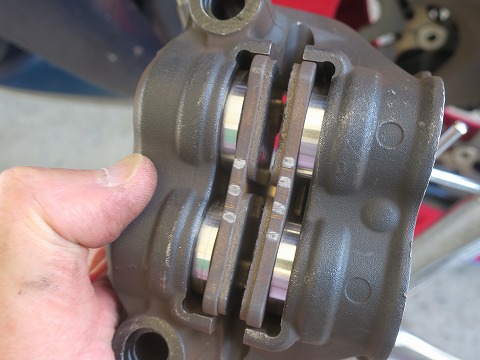 8:59 パッドの残りを フロントタイヤを入れ替えたタイミングでパッドの残りをチェック。 モリワキ製のパッド (ブレーキの)効きも悪くなくて、(価格も)高くなくてよかったんですけどね。 使用限度が、取説に6mmまでって記載がありました。 計ってみたら、6.05mmとかのパッドも・・・。 ほぼ終わりなので、思い切って交換することにします。 |