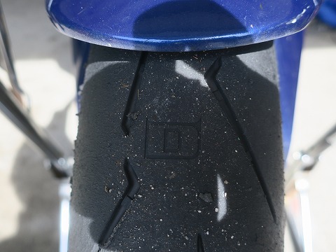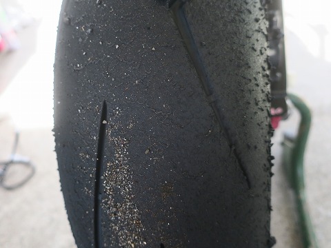 11:52 走行後の 走行後のリヤタイヤ。 まあそれなり。 普段筑波サーキットを走っている時よりは若干タイヤかすの出かたが多いかな。 筑波に比べるとエビスサーキットの方が舗装が荒れてたりする影響もあるかな。 |
