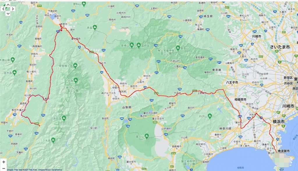 | 午前の道程:自宅(横須賀)~横浜町田 IC ~ 諏訪 IC ~ 国道152号線 ~分杭峠~大鹿村 ~ 上村:330.56km | |