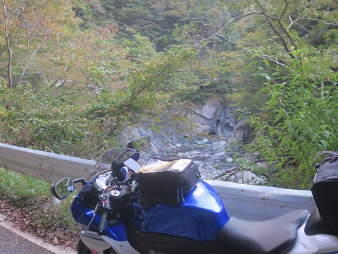 14:49 明神峡に 山住峠から先の県道389号線は東進から南下に進路を変えます。 山住峠を通過した直後、対向で大型のトラックが来たのにはビックリ。 「ええっ! この狭い山道を登ってきたの。」 (実際、よく曲がれたもんだと感心してしまいます)(笑) 県道389号線を下ると、途中に門桁(かどけた・かどげた)取水ダムの堤頂を渡り、気田川(けた がわ)に沿って走り始めます。 (門桁は地名みたいです) さらに気田川に沿って県道を走ると、途中にある景勝地と言われる明神狭までやってきました。 バイクを停めて、写真を撮ったけど、イマイチだった。 無理にバイクを画角に入れたのがよろしくなかった様で。 |