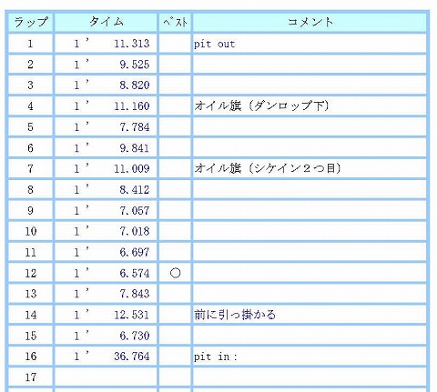 その後は前に引っ掛かったりして、タイムを延ばすことが出来ず15周で1本目の走行は終了。 |