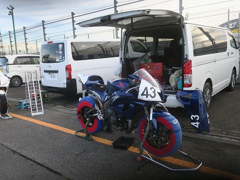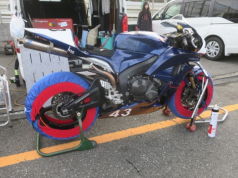 タイヤウォーマーを巻いていますが、走行が9時15分からなので、もう少し後に電源を入れればいいかな。