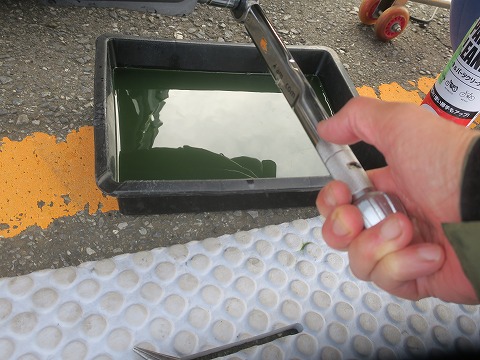 時間があるので、10分くらいかけてオイルを抜いて、ドレンボルトをトルクレンチを使って締付け。