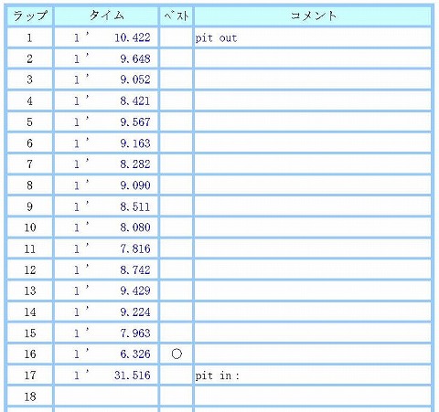 9:15〜9:35 B2クラス 9時15分からB2クラスの走行が始まりました。 違うタイヤを短い期間で履き替えると、タイヤの違いがわかりやすいですね。 やっぱり今履いているV3の方が、前回履いたV4に比べると、接地感が薄い様に感じますね。(個人的な感想です) 理想は、実際のグリップと接地感が一致していることなんでしょうけどね。 その辺りは、個人的な感覚で一人ひとり違うので、一概には言えないでしょう。 それと、V4の様にグリップ感がしっかりしているとして、実際はその前にグリップが無くなるようなタイヤだと、信じて攻められないですよね。 自分では、そこまで攻められないので、今のところV4のグリップ感に甘えてる様な状態です。(って、わかりにくい文章ですね) さて今日1本目もフルの35台走行。 路面温度も低いので、最初はペースを抑え気味で。 前にいいペースのリッターバイクが居たので追走していたけど、P-LAPのタイム見たら、あらっ、よろしくありません。 1000ccのバイクに追走すると、ストレートで離されて、コーナーの入り口で追いついて、コーナーリング中はまず抜けないから後ろに付く感じで、立ち上がりは離されるパターン。 一生懸命走っているつもりでも、実際はこれだと自分の600ccの良いところが行かせてない走りになっちゃってるんですね。 理想的には、600ccの方がバイクが軽い分コーナーでちょっと速く走れるはずです。 そのコーナーリングスピードを生かしてコーナーを立ち上がると、ストレートのスピードも伸びてタイムも縮まるはず。(タラれば論です) そうゆう走り方が出来るほど器用じゃないので、タイムがよろしくありませんでした。 (+_+) 結局、徐々にペースを上げていって、最後の最後16周目にベスト6秒3でチェッカーが降られて、1本目終了です。 |