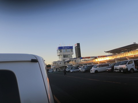 708 定点観察 走行前の下準備が出来たらホームストレッチに向かいます。 途中、いつもの場所でコントロールタワーをバックに定点撮影。 この位置から見る空は南西の空。 雲一つなく、空気も澄んで、晩秋の雰囲気です。 走行券はまだ買いません。 7時からの発売開始時刻は混んでるからね。 |