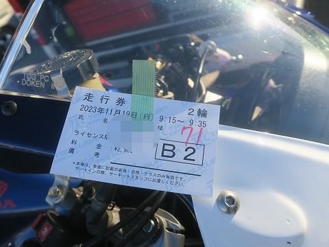7:45 走行券を ライダース ブリーフィングが終わった後、走行券売り場をのぞいたら、並んでいる人が少なかったので、走行権を買ってきました。 今日、1本目は9時15分から。 (さっきも書いたね。 歳を取るとしつこくなるけど、面倒臭いから消さない)(笑) 軽く朝一の暖気をしておきます。 |
