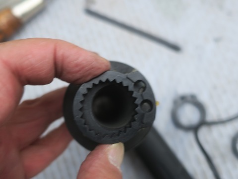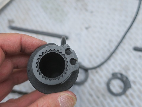 15:57 右側のグリップ 右側のグリップ取れたよ。 上の丸い2つの穴は、アクセルワイヤのタイコが入る部分ね。 引き側ワイヤーと戻し側のワイヤの2つあります。 |