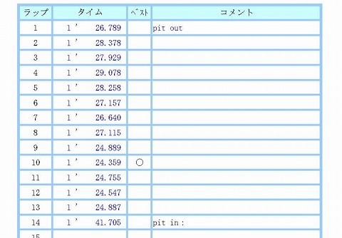 10:15〜10:35 B3クラス 路面はまだ濡れていますが、今年(2023年)最後の走行になると思うので、コースに出ることにします。 あんまりコンディションが悪かったら、無理する必要はないのでピットに戻ってくればいいだけですから。 サーキットでウェット コンディションで走るの久しぶり。 以前はレインタイヤを持っていましたけど、今は持ってません。 コースをグルっと走ってみると、まだ8割り方濡れてますね。 水はけが良くて、日が当たるところだけ、乾いてますが・・・。 おっかなびっくり周回を重ねます。 走っているのは5台もいないんじゃないかな。 前後に居ないので、良くわかりませんが。 まあ、1台で走っているのと同じようなものなので、自分のペースで走れますが・・・。 普段の10秒落ちぐらいで走っているかと思って、計測器を見たらほぼ20秒落ちでした。(笑) まあ、無理して転んだり、怖い思いをしても仕様がないので、淡々と走ります。 いつもよりとっても遅いペースで13周目にチェッカーを振られて、この走行終了です。 |