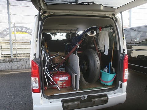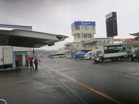 11:42 積込み終わり だんだん路面が乾いていくのを横目に見ながら、積込みが終わりました。 片づけている最中走れるクラスないかなぁ。って思いましたけど、午後はナンバー付きバイクの走行枠なので走れません。 まあ、こんなコンディションのときもあります。 |