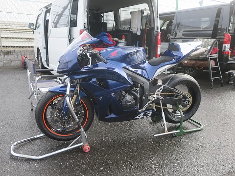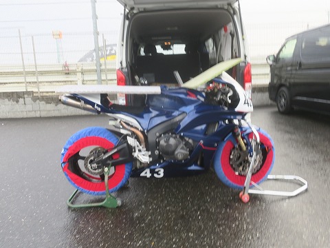 7:50 準備はする まだ雨が降り続いてますが、走行の準備はします。 今日1本目の走行は9時から予約を入れてあります。 雨降ってたり、路面がウェットだったりしたら、走りませんけどね。 小粒ですが雨が落ちてくるので、CBRはハイエースのリヤゲートの下、ハンドルやシートが濡れないようにバスマットを上に置いておきます。 |