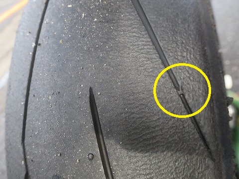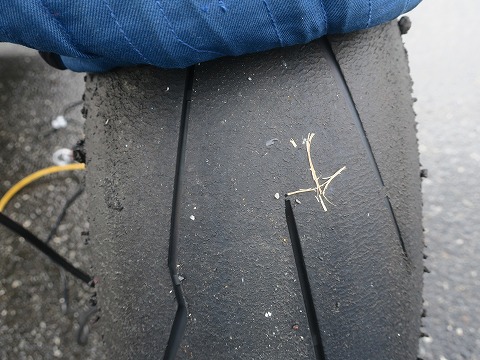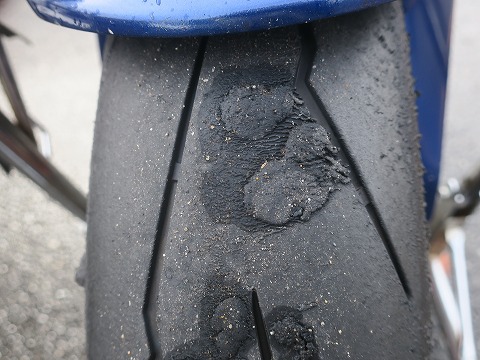 10:42 走行後の リヤタイヤは。 戻ってきた直後は濡れてましたが、タイヤが暖かいので乾いちゃいましたね。 ドライの時の様に消しゴムのカスみたいになって飛んでいくんですが、タイヤカスまでにはならなくて、表面がベトベトしている感じ。でした。 スリップマークも出てるけど・・・・。 もう、あきらめましょう。 と言うより、もうそろそろ新しいタイヤに切り替えたほうがよろしいかと。(笑) |