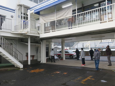 8:09 ライダースブリーフィング 8時10分からライダースブリーフィング。 いつもコースオープン前はホームストレート上でブリーフィングをしますが、今日は雨降っているので券売所の下。 普段はレッカーとかが停まっているところだね。 |