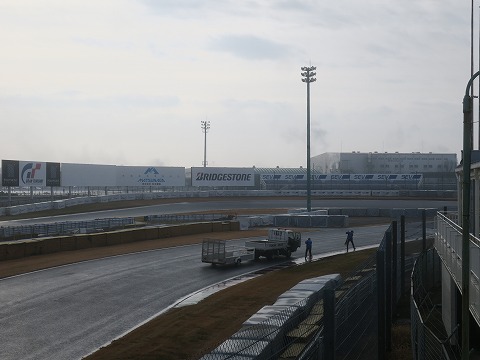 8:51 コース状況は 走行10分前になりました。 タイヤサービスのある建物の2階に上がって、S字〜1ヘアピン〜ダンロップブリッジ下のコース状況を確認。 雨はやみましたが、コースは完全にウェット コンディションですね。 サーキットのスタッフがたまった水をコース外に掃き出していますが・・・。 「ダメだ、こりゃ。」 1本目は走らないことにします。 |