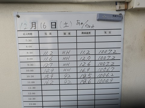 11:15 コンディションは 本日のコンディションをコースインゲート脇のコンディションボードで確認。 今日のコンディションは・・・・。 (走ってないけど)1本目の9時からの走行の時は 9:00 気温 11.6℃ 路面温度 12.0℃ 9:30 気温 12.7℃ 路面温度 12.6℃ 2本目の10時15分からの走行の時は 10:00 気温 14.9℃ 路面温度 16.9℃ 10:30 気温 15.9℃ 路面温度 18.5℃ 気温と路面温度だけ見てみると、11月の走行のときとほとんど変わらなかったです。 けど、ウェットじゃね。(笑) |