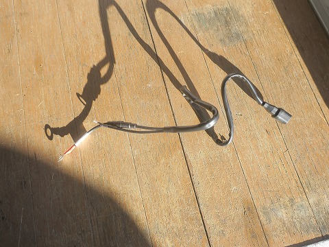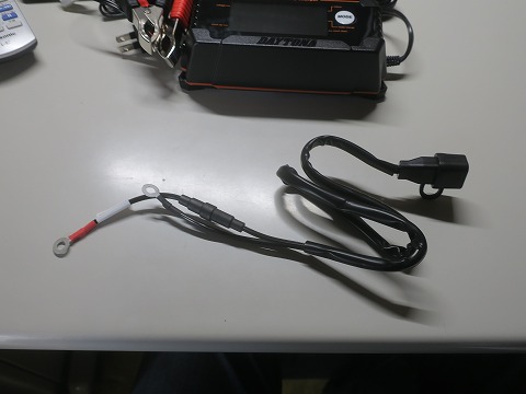 こんなケーブル 接続されていたのは、こんなケーブルですね。 左端はバッテリにつないでおいて、右端のコネクタに充電器を接続するもので、コネクターに防水キャプが付いていて、付けっぱなしでいいみたい。 |