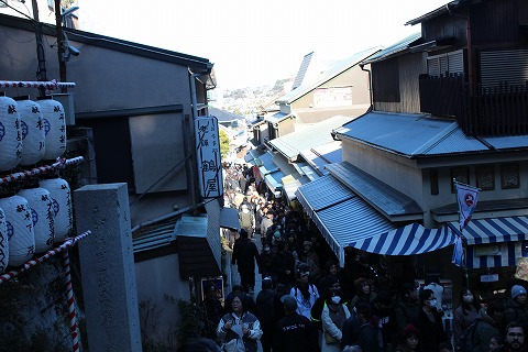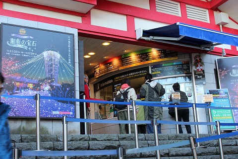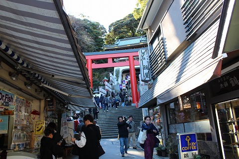 11:11 参道です それでは、灯台に向かいます。 江の島には江島神社があって、神社を中心に街並みが造られている感じです。 江の島にある神社は”の”が無くて江島神社と書いて、”えのしまじんじゃ”と読みます。 江の島灯台には参道を通って行きます。 入口には青銅製の三の鳥居がお待ちしています。 その先、道の両側には飲食店やお土産屋さんが並んでいます。 今日は正月4日で、初詣に訪れた人で溢れかえっています。 |