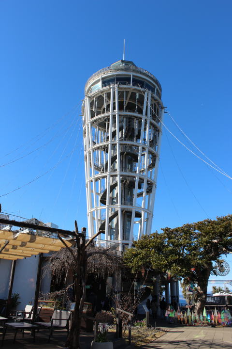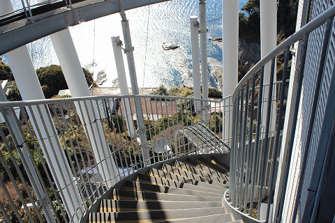 12:02 戻る 最後に後ろを振り返る。 灯台から垂れ下がっているヒモの様なものは、LED照明。 ライトアップしている様子を見たい人は夜訪れてみよう。 江の島灯台も観光したので、戻ることにします。 |