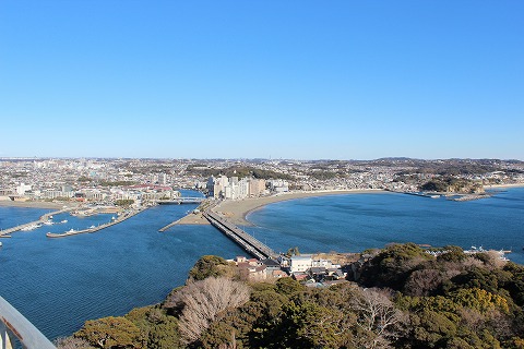 11:50 北側は 上に登った。 風強い。 寒い。 まずは北側。 眼下に見えるのは、さっき渡ってきた江の島大橋。 よーく見ると並行に2橋あるのがわかります。 左手の細い方が人道橋の江の島弁天橋。 人が歩いているのが見えます。 橋の下には砂洲が形成されているのが見てわかります。 |
