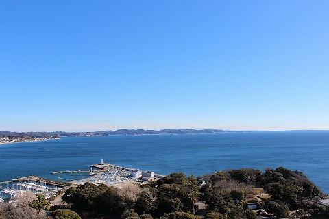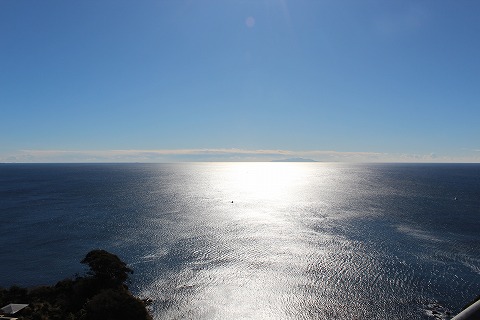 11:51 南側は 天気、最高。 水平線近くに伊豆大島が見えています。 (中央から少し右手) 距離はおおよそ60km。 そんなに遠くではありません。 |