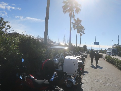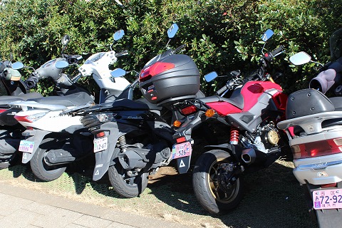12:36 バイクのところに 江の島をうろうろしてバイクを駐めてあるところに戻ってきました。 この裏にもバイクを駐められる場所があります。 こうして見ると、バイクできている人も多いんですね。 ちなみに22時以降〜朝5時までは車両進入禁止です。 |